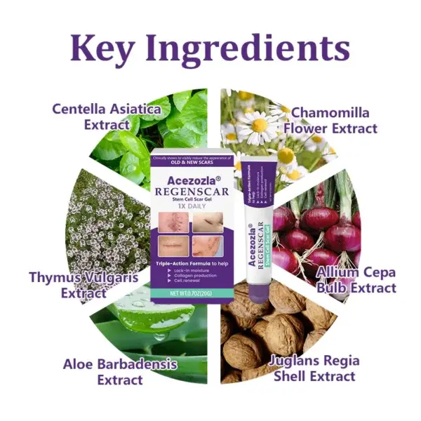 Acezozla® ReGenScar Stem Cell Scar Gel, developed in collaboration with board-certified U.S. dermatologists. It delivers professional-grade skincare with every application. Its advanced formula is designed to significantly reduce the appearance of both new and old scars, including surgical scars, stretch marks, keloids, acne scars, burns, warts, skin tags, and varicose veins.